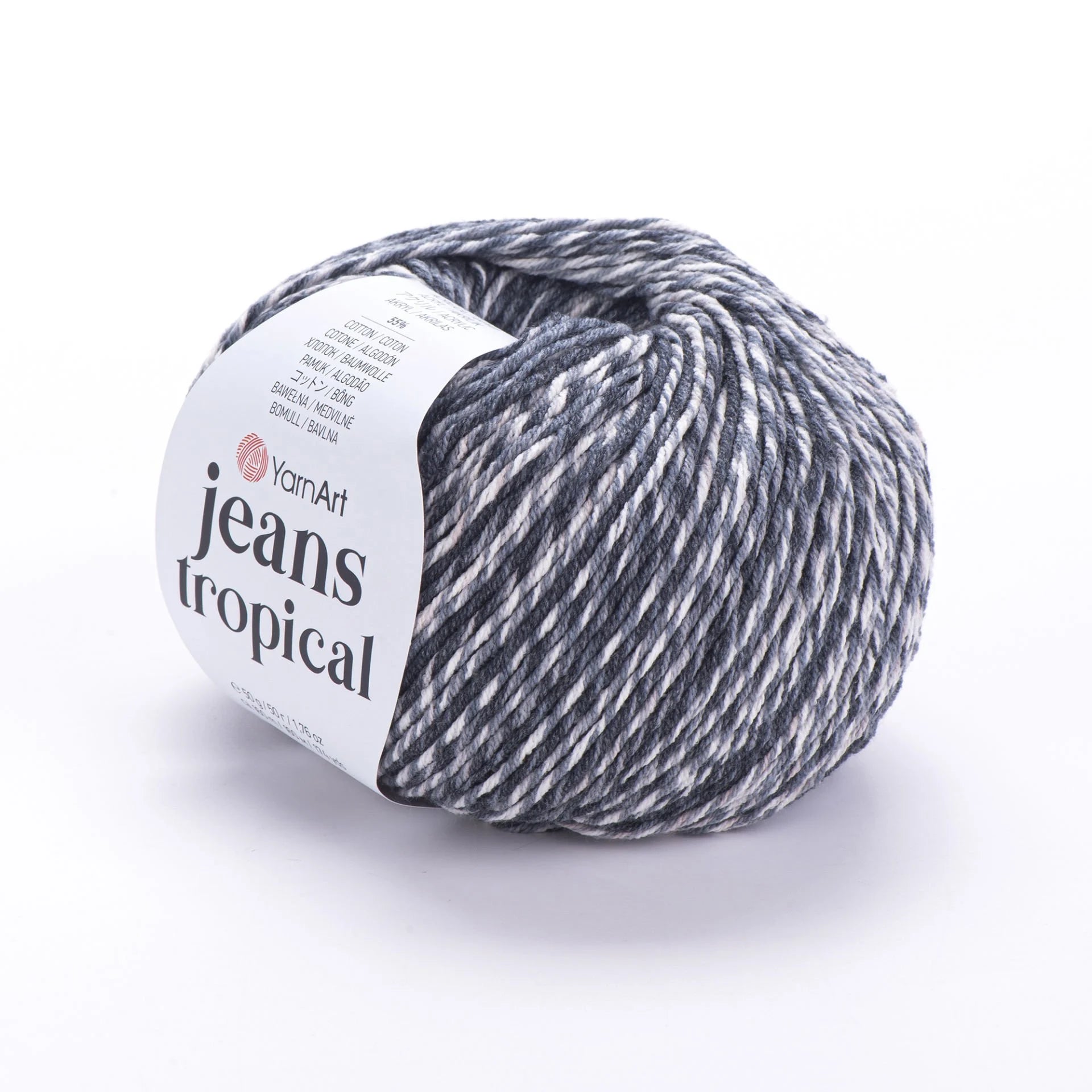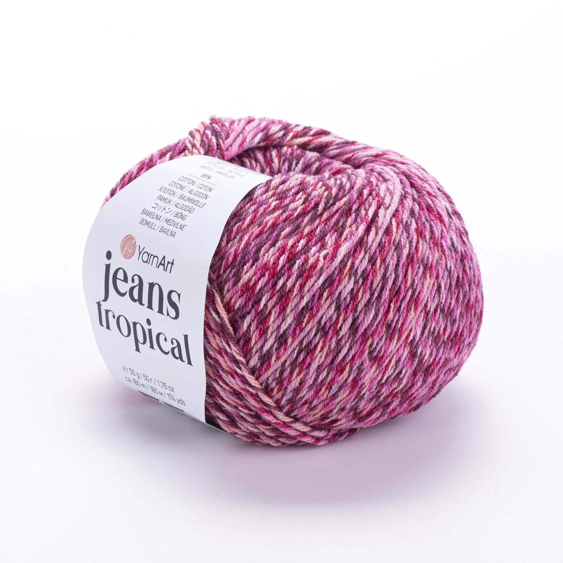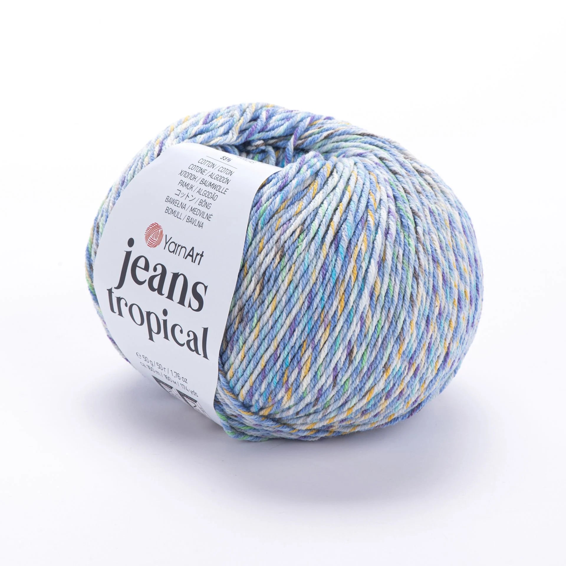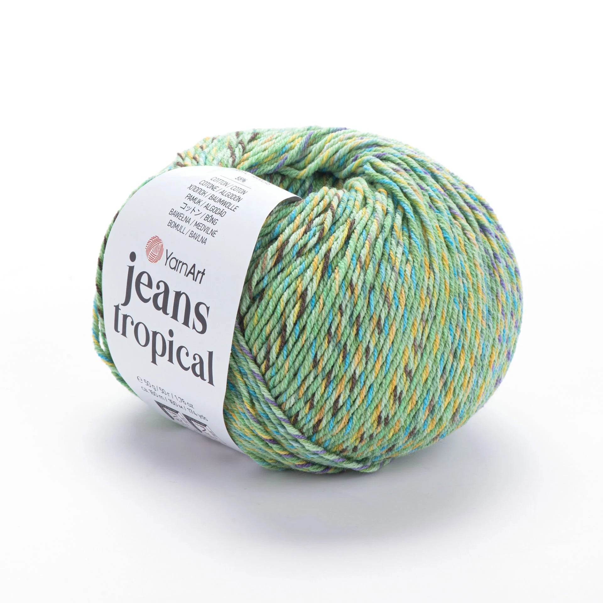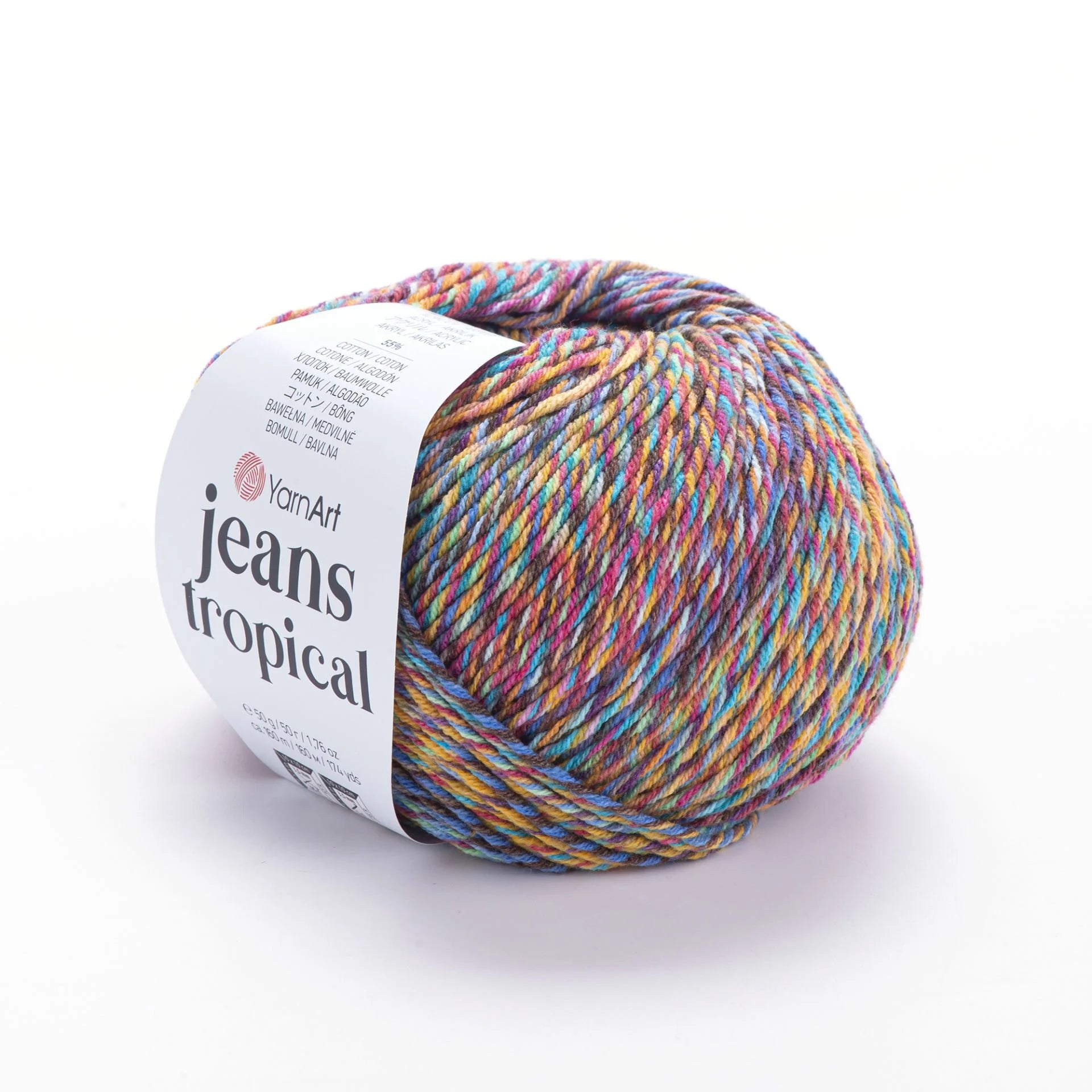 YarnArt Jeans Tropical Ebruli is a soft, sport-weight, multicolor yarn with a cotton-polyacrylic blend, ideal for lighter summer projects like tees, amigurumi toys, and accessories. The vibrant “tropical” color transitions add a playful, sunny flair to your creations. Due to its variegated dye process, subtle hue variations may occur between skeins—buy enough in one go to ensure color consistency.