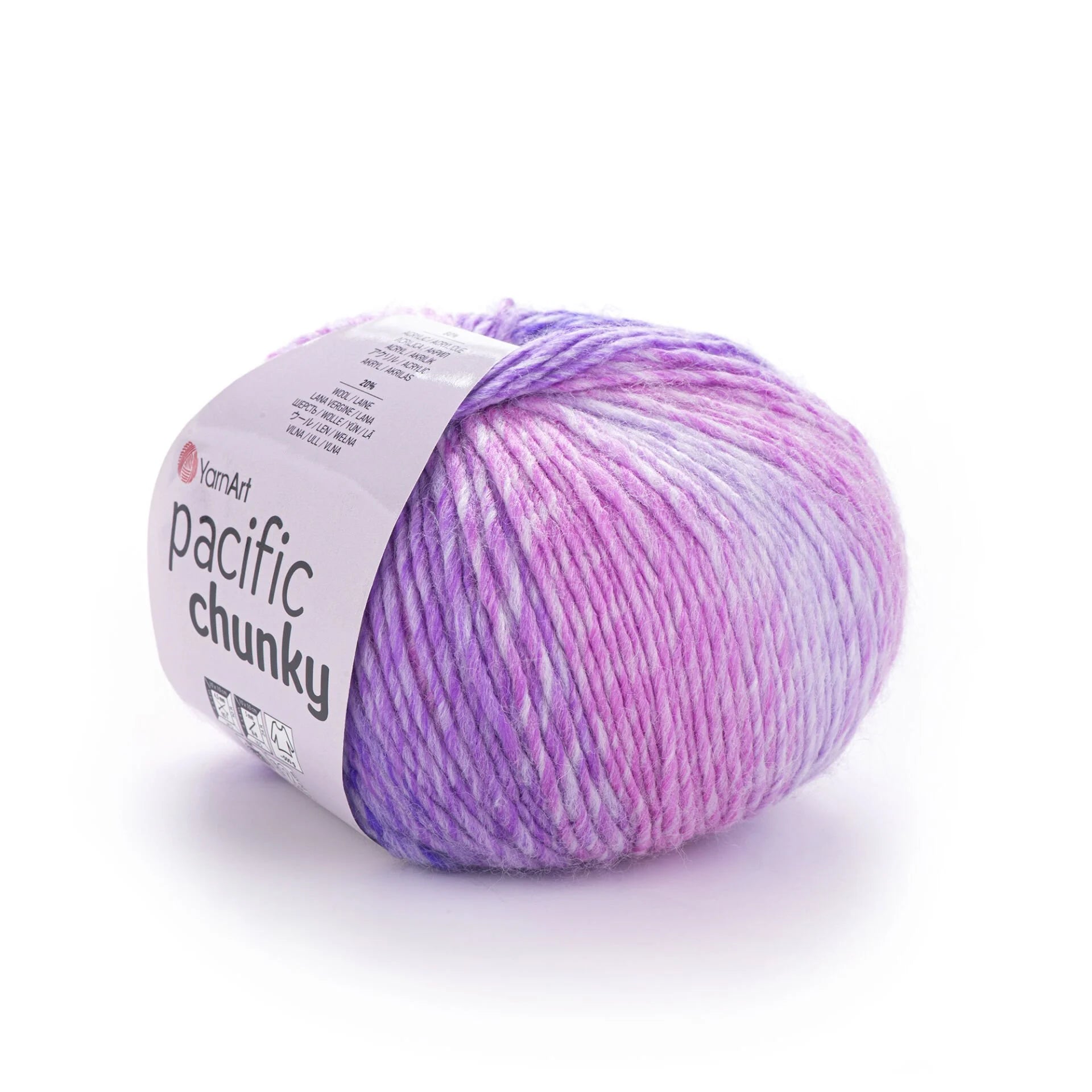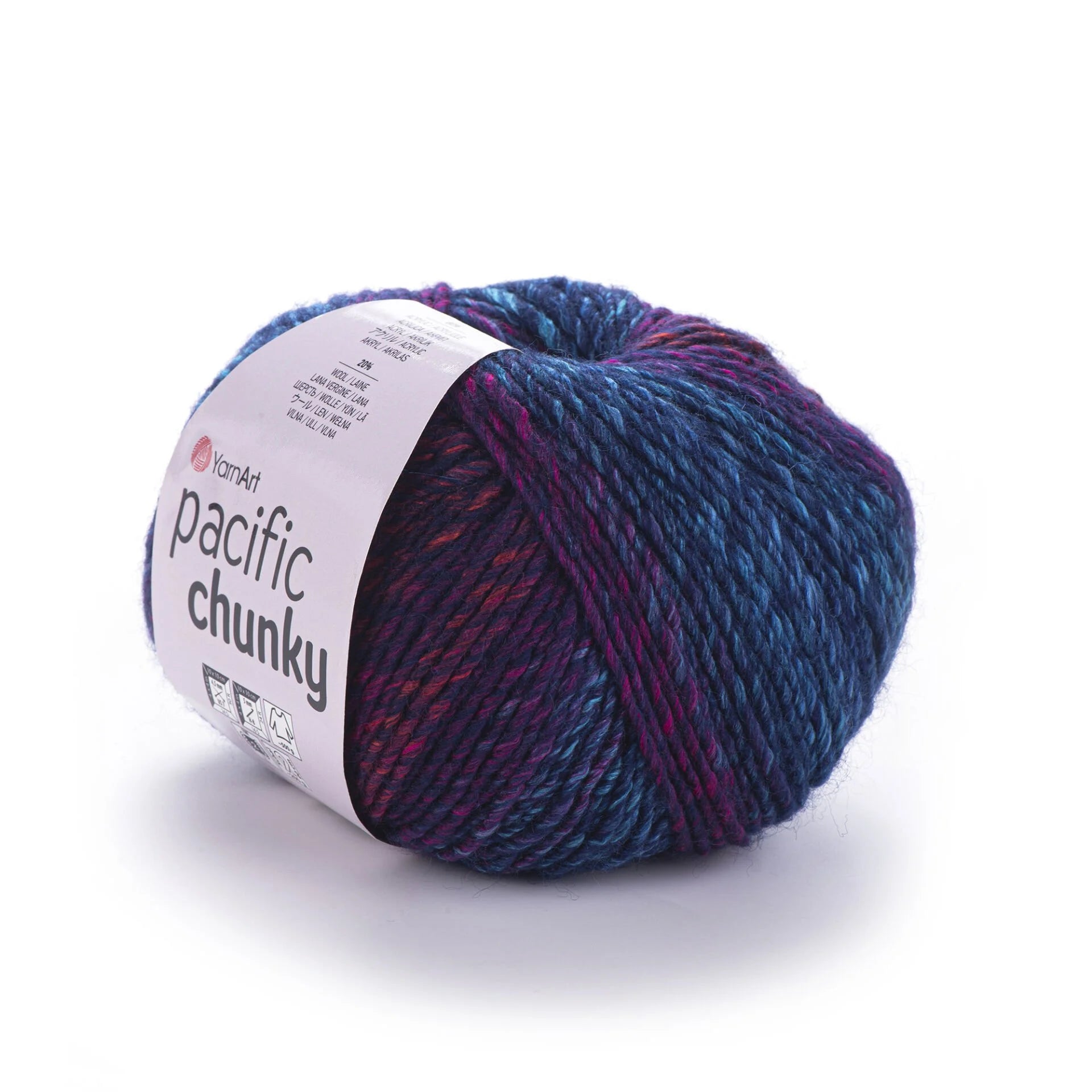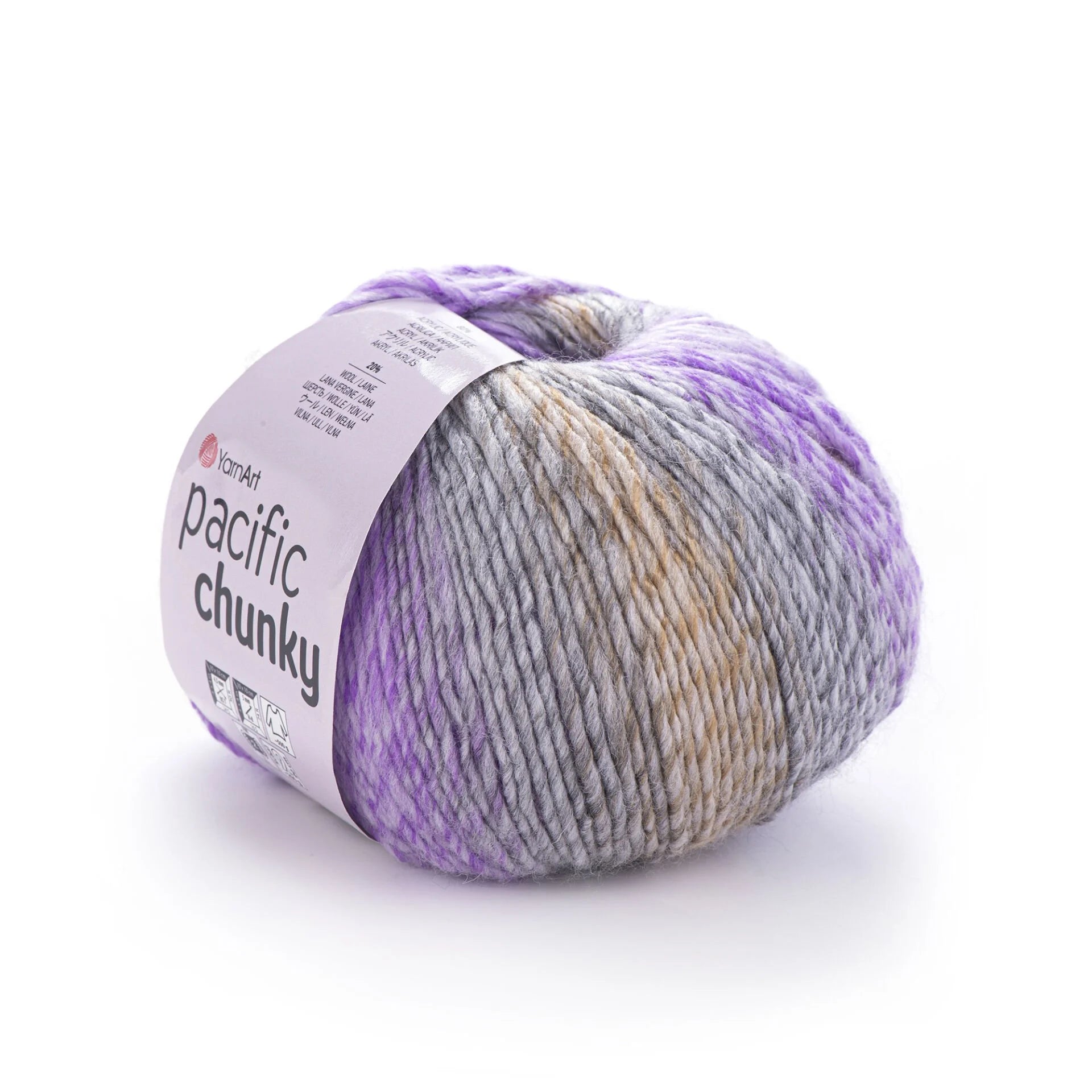 YarnArt Pacific Chunky Ebruli is a plush, bulky yarn (20% wool, 80% acrylic) with pre-striping ebruli coloring. With 200 m in each 100 g skein, it's perfect for quickly knitted or crocheted fall and winter essentials—such as sweaters, scarves, and hats—offering warmth, softness, and beautiful, built-in color variations.